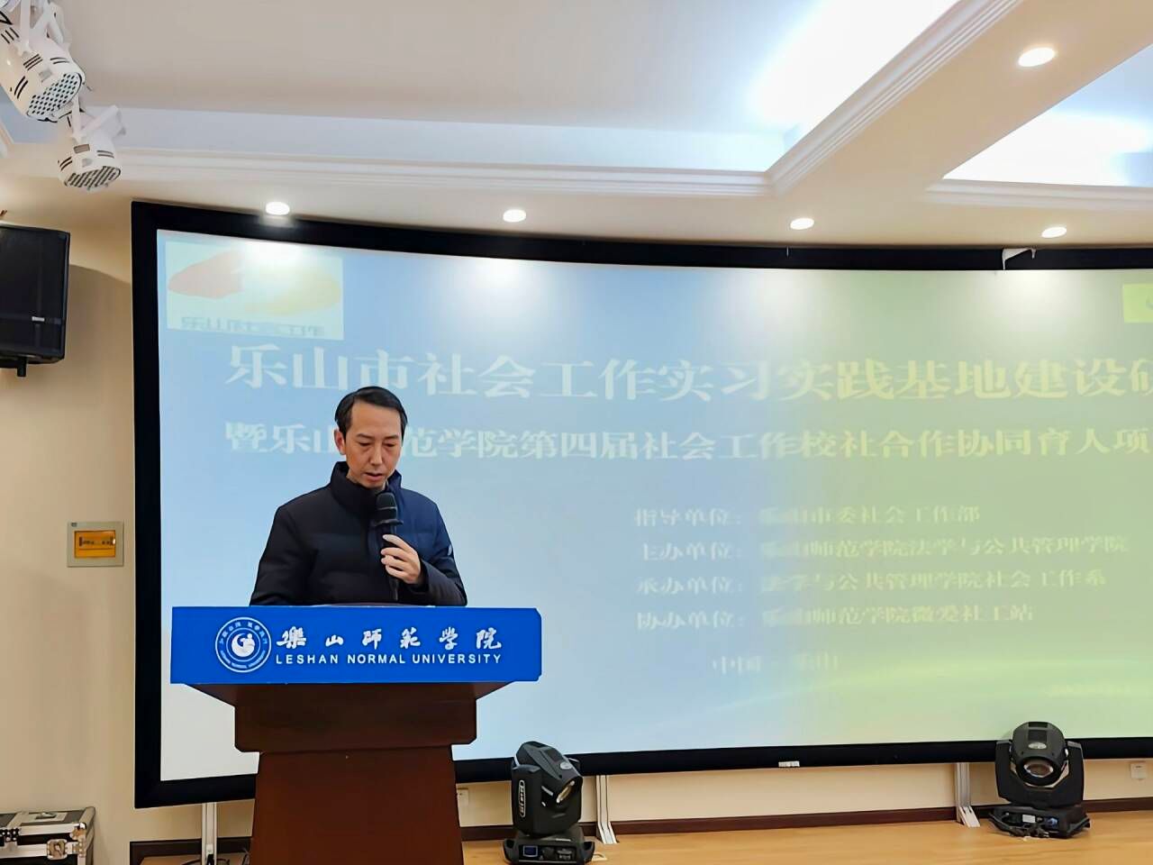 在领导致辞环节,乐山市委社会工作部副部长荣华春发表了热情洋溢的讲话。他充分肯定了乐山师范学院在社会工作人才培养和服务地方发展方面取得的显著成效,高度评价了校社协同育人模式对乐山市社会工作专业人才队伍建设的积极贡献。荣部长指出,社会工作在创新基层治理、服务重点群体、促进社会和谐中扮演着关键角色,希望政、校、社三方继续深化合作,共筑人才培养新高地,勉励同学们珍惜实践机会,练就服务社会的真本领,共同开创乐山社会工作事业发展新局面。
