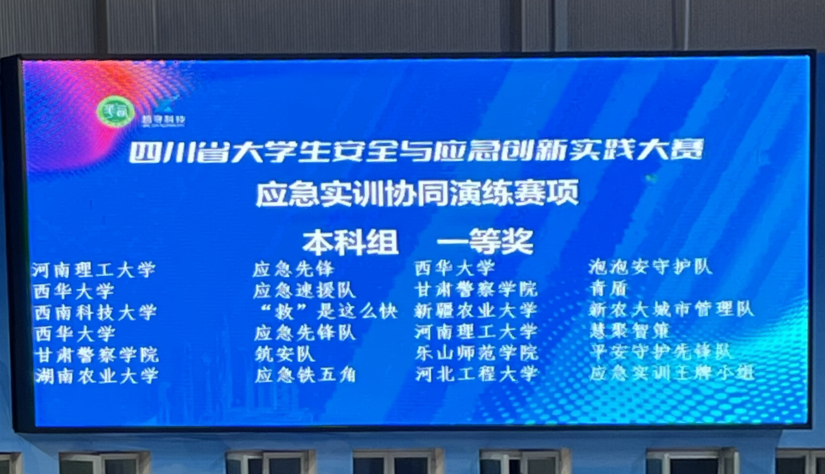 本网讯(文/晏德巧 图/叶彤 审核/赵勇)11月1日,由四川省教育厅主办、西华大学承办的四川省大学生安全与应急创新实践大赛在西华大学落下帷幕。经过激烈角逐,我院2023级行政管理专业5名学生组成的参赛团队(成员:晏德巧、杜雨凌、税海媛、张崇君、靳芮),在指导教师叶彤的带领下,从全国本科组42所高校74支队伍中突出重围,以全维度优异表现勇夺应急实训协同演练赛项一等奖,充分展现了我校学子“懂理论、会协同、能实战”的专业风采与责任担当。